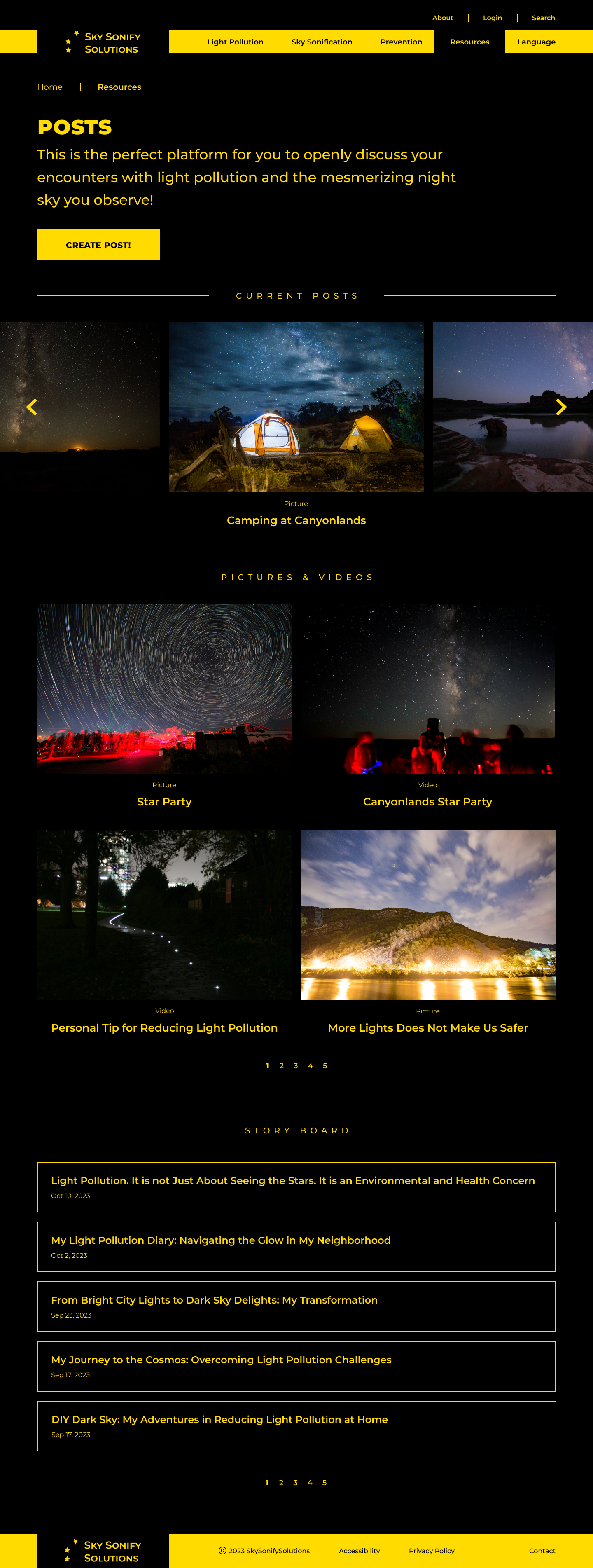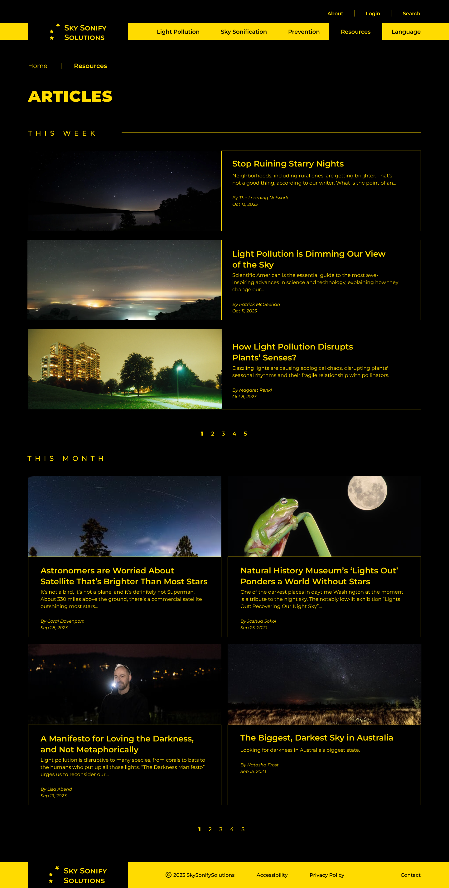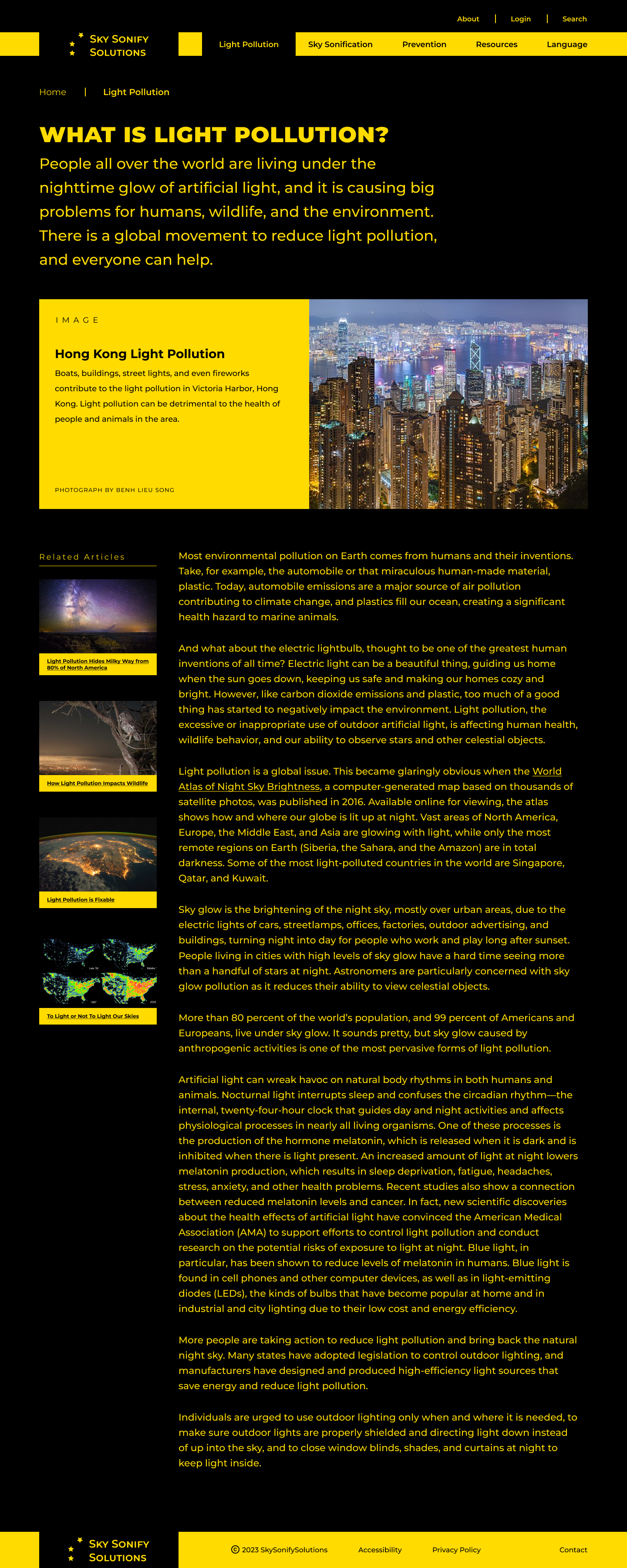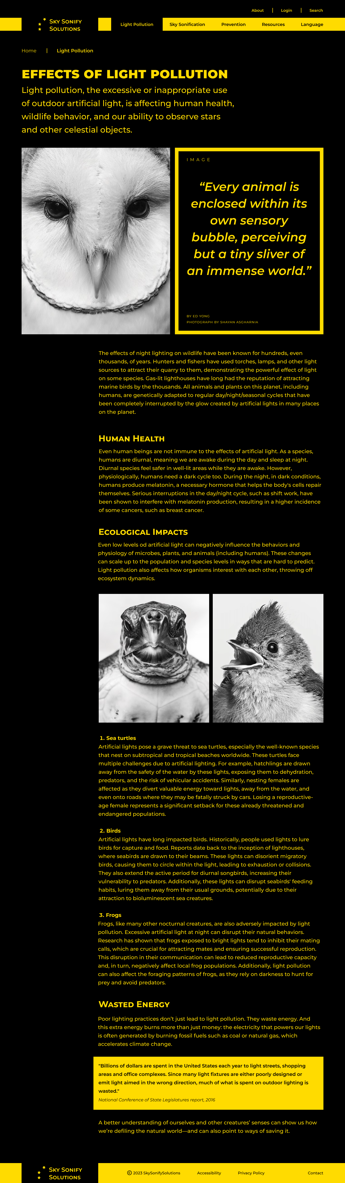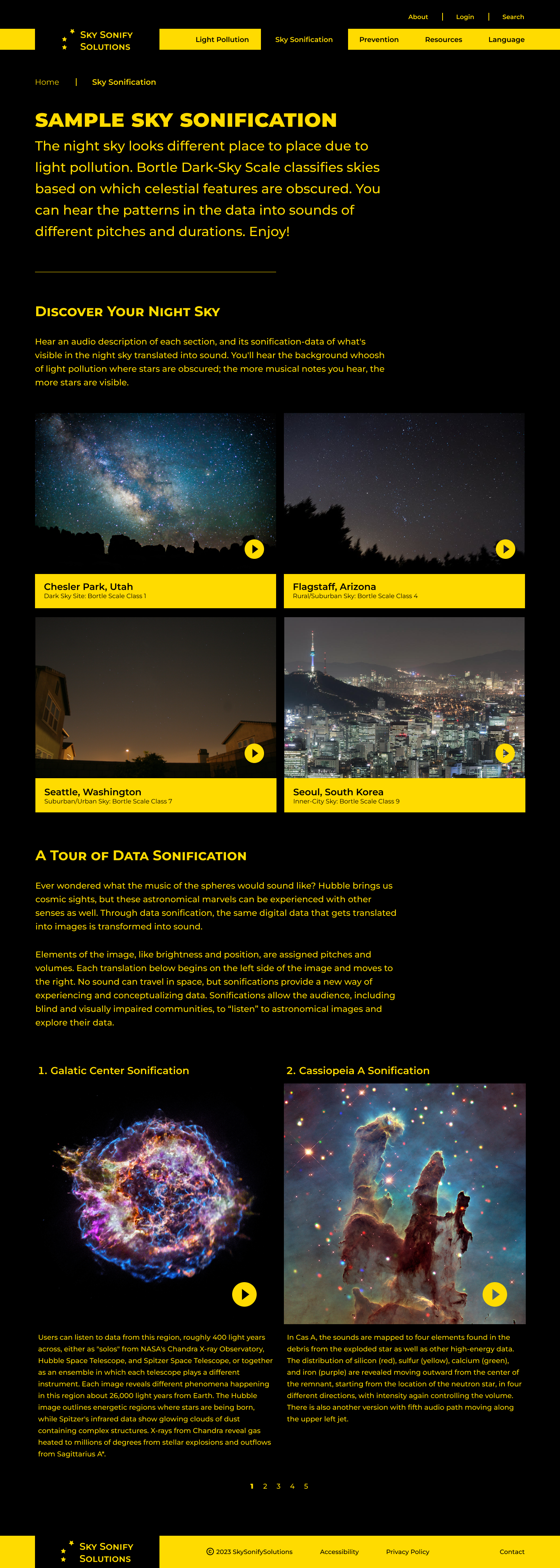 I designed a website logo featuring three yellow stars forming the Braille letter "S." The name "Sky Sonify Solutions" suggests that the website offers solutions related to light pollution, which aligns well with my goal of providing information about pollution, sky sonification, and prevention tips.