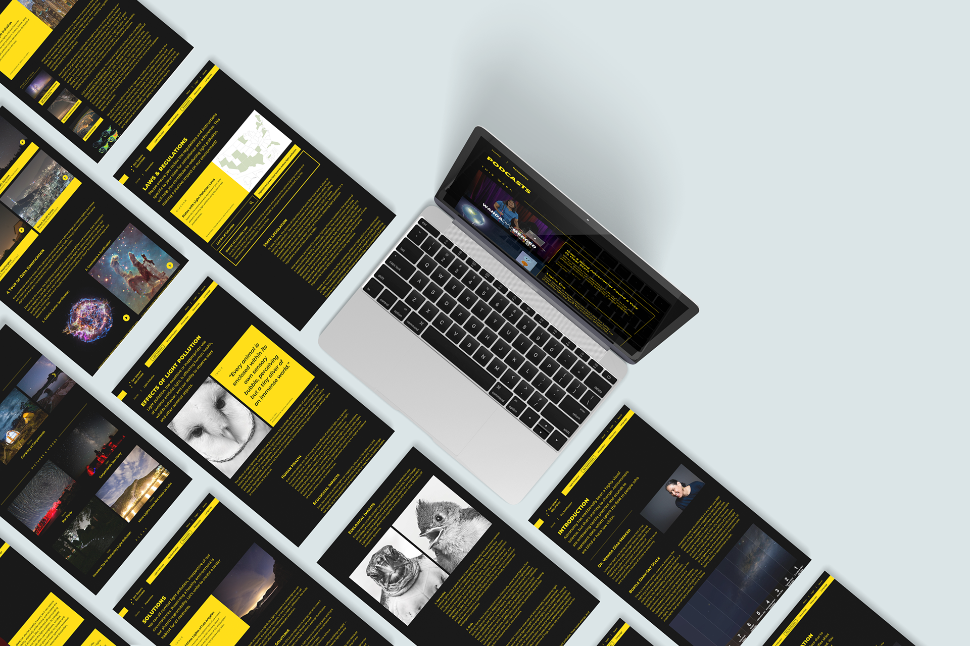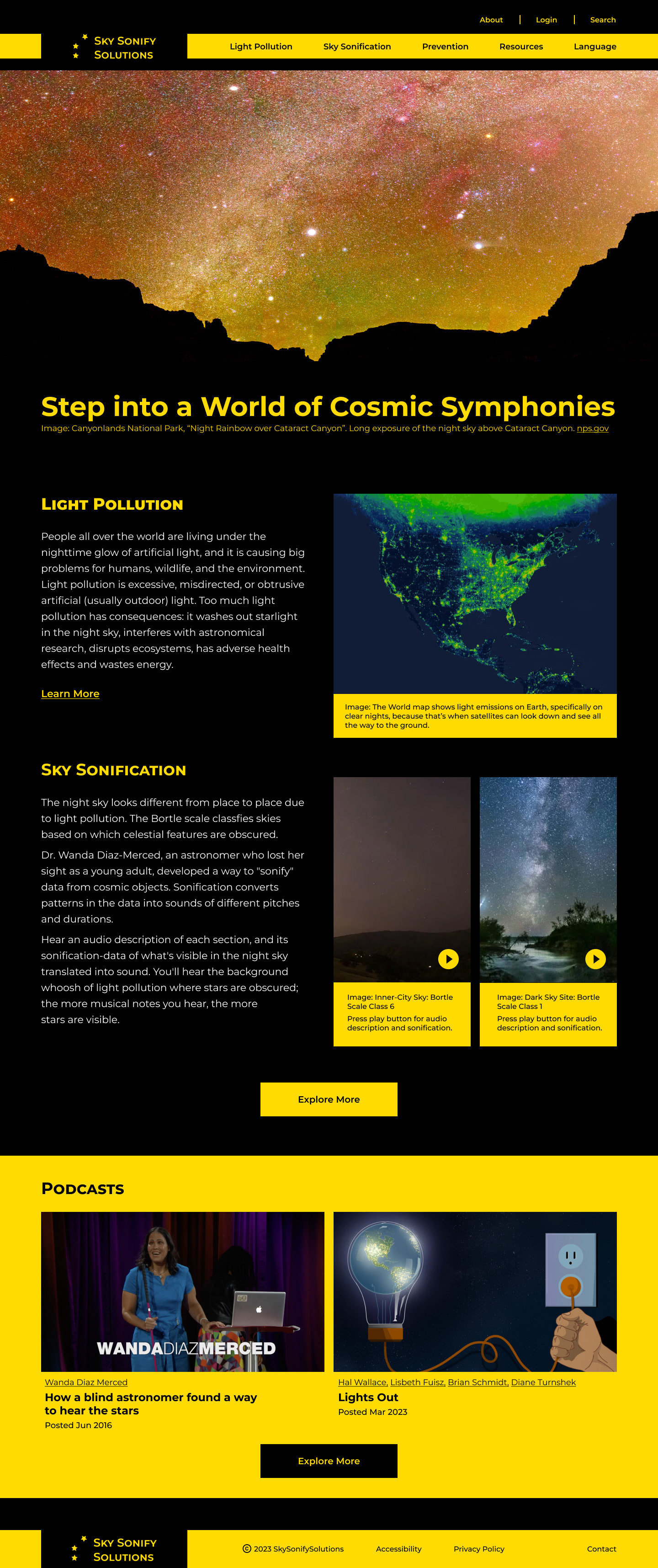 The homepage features a hero image of the starry night sky at Canyonlands National Park, with a heading designed to influence visitors. Visitors can explore brief information about light pollution, sky sonification, and podcasts as they scroll down.